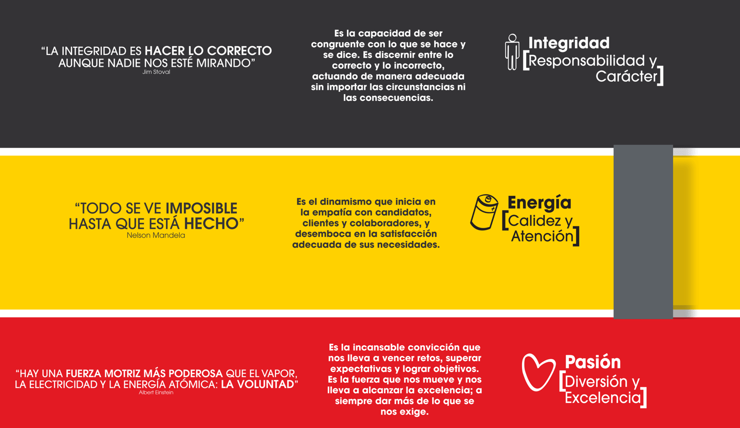 Dar soluciones innovadoras, eficientes y efectivas a los retos de integración y desarrollo de talento de nuestros clientes, promoviendo una cultura de competitividad responsable y sustentable.